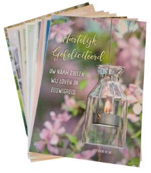 Pakje kaarten - Pakje met 10 gesorteerde prentbriefkaarten met bloemen en landschappen. Opdruk: Hartelijk gefeliciteerd Met Bijbeltekst in de Statenvertaling Afbeeldingen kunnen afwijken van de afbeelding op de website. Meer